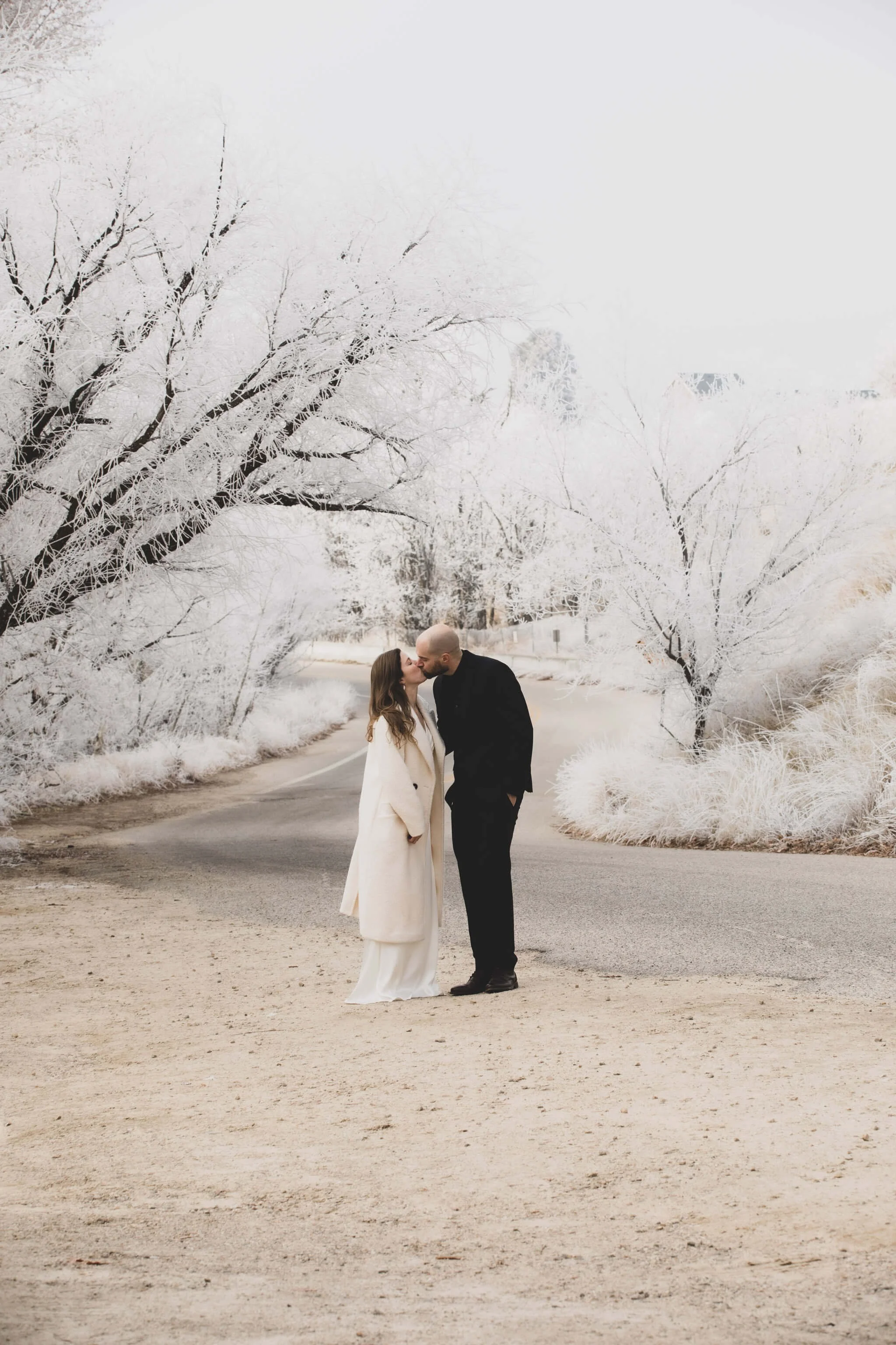 The four of them hiked up to the viewpoint at the top, and everything was covered in frost. The trees shimmered, the ground sparkled, and the crisp winter air gave the whole scene an ethereal feel. It felt like we had stepped into a snow globe. Watching them snuggle their pups, laugh together, and take in the view as newlyweds was such a joy to capture.